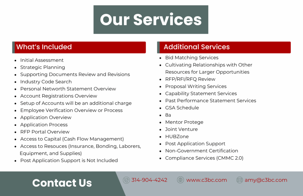 Beyond certification assistance, our team offers proposal writing, capability and past performance statements, bid matching, compliance services, access to capital insights, and connections to resources like insurance, bonding, labor, equipment, and more. Our hands-on approach ensures that once certified, your organization is ready to tap into billions of dollars in available government and non-government contracts.