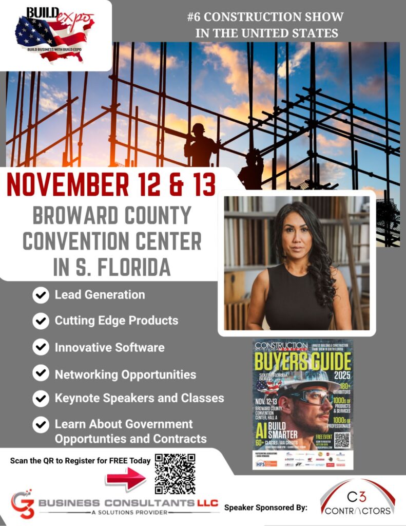 We’re exactly One Week away from Build Expo USA in South Florida! Spots are flying fast so make sure you register, using the QR code below, before it’s too late! Join myself, and C Three Business Consultants, as we cover the complexities of government contracts and how to navigate them. We look forward to seeing you for Build Expo USA at the Broward County Convention Center!